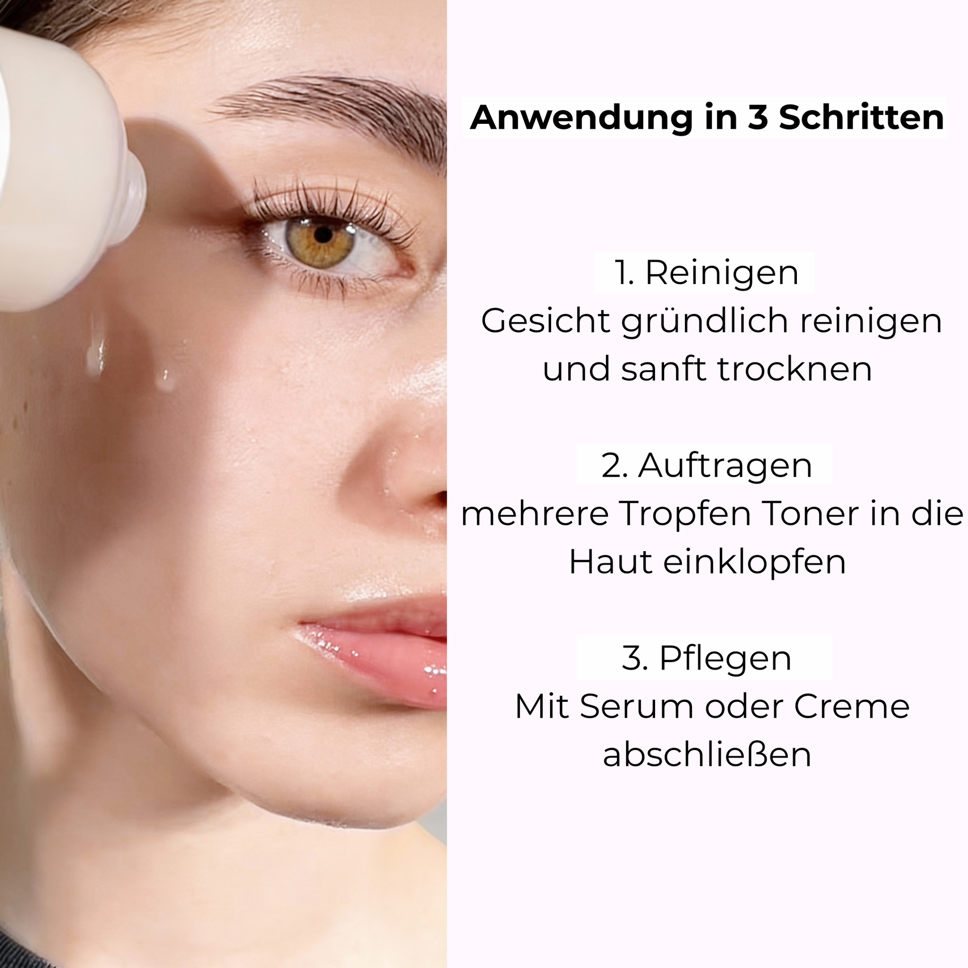 Nach der Gesichtsreinigung eine kleine Menge auf ein Wattepad oder direkt in die Hände geben und sanft auf Gesicht und Hals einklopfen. Anschließend Serum und Creme auftragen.